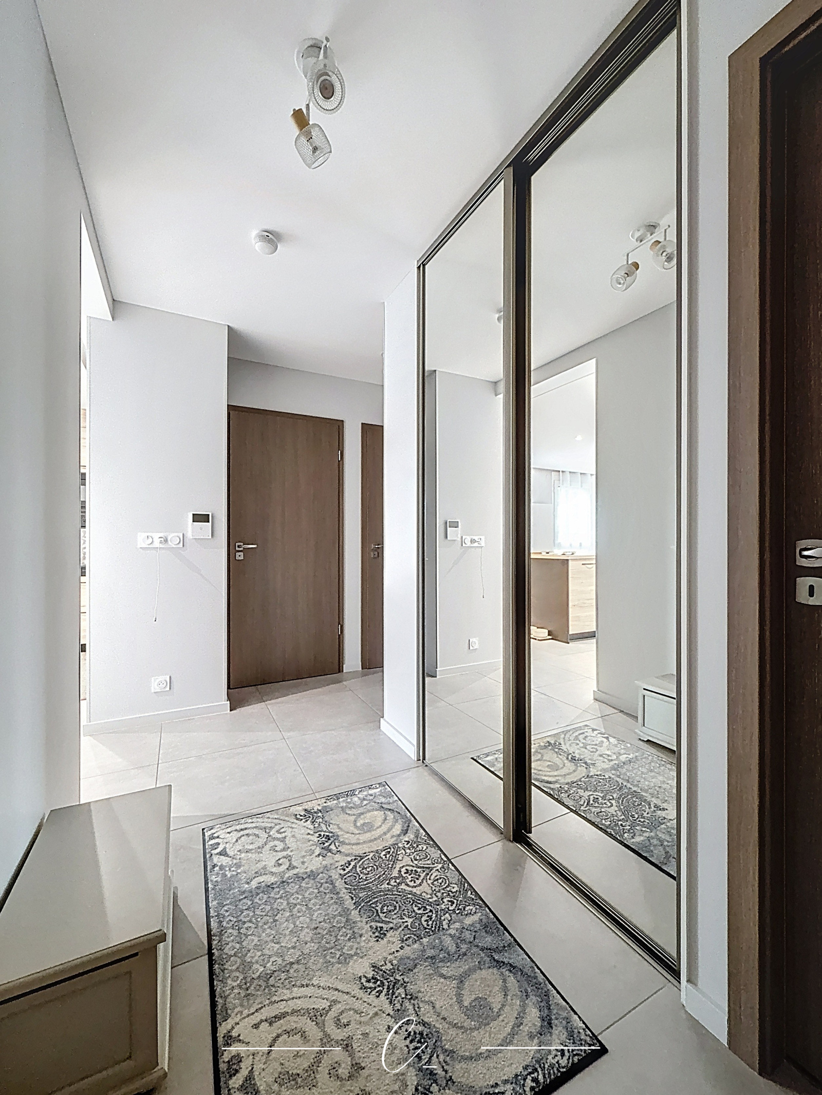 Il se compose d’une entrée avec un grand placard double, d’une belle pièce de vie lumineuse avec cuisine ouverte entièrement équipée et ilot central, de deux chambres avec dressings sur mesure optimisés, d’une salle de bain contemporaine ainsi que d’un WC indépendant.